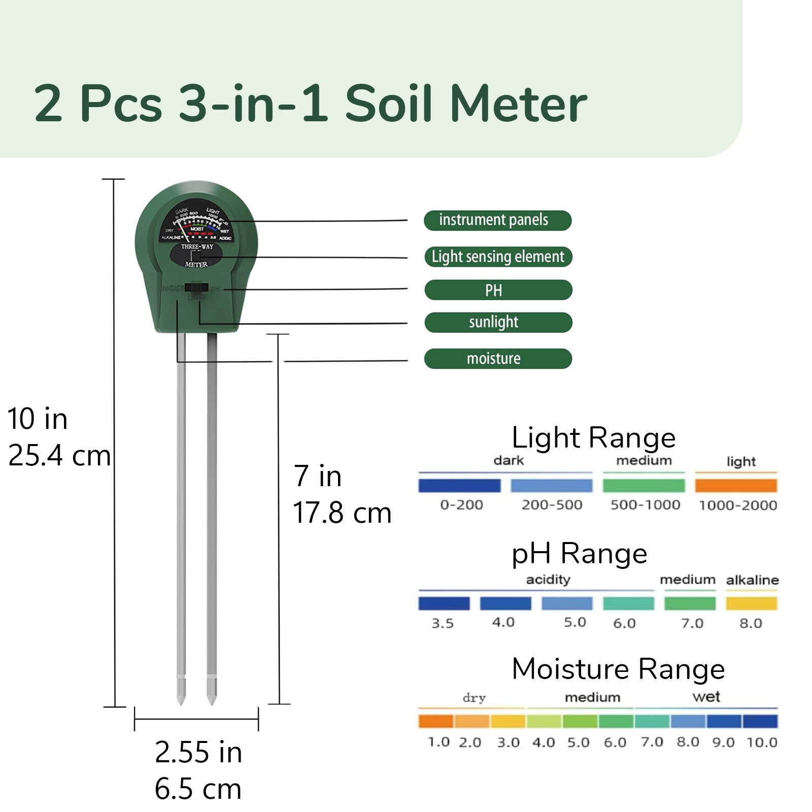2 Pack 3-in-1 Soil pH Moisture Light Meter